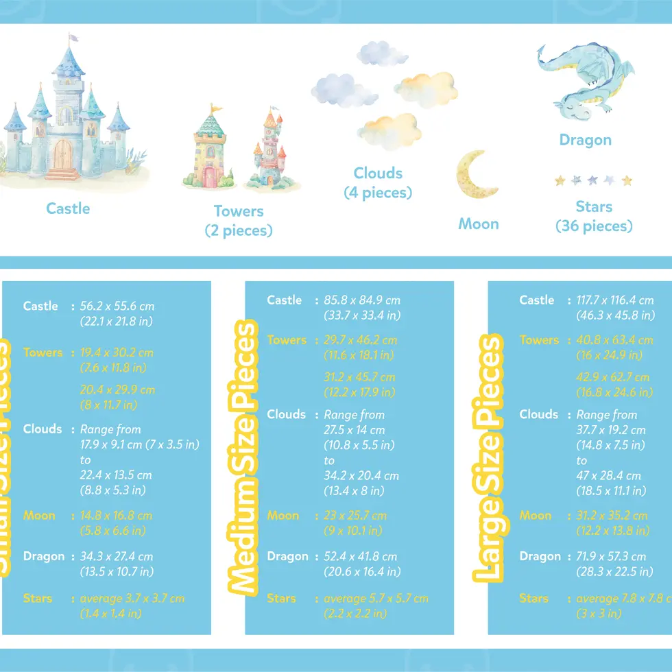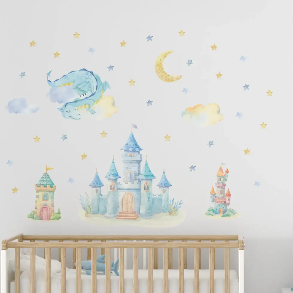 Tags: schloss wandtattoo, märchen babyzimmer deko, aquarell drachen sticker, mond und sterne wandkunst, kinderzimmer wandbild, magisches kinderzimmer, baby wandkunst