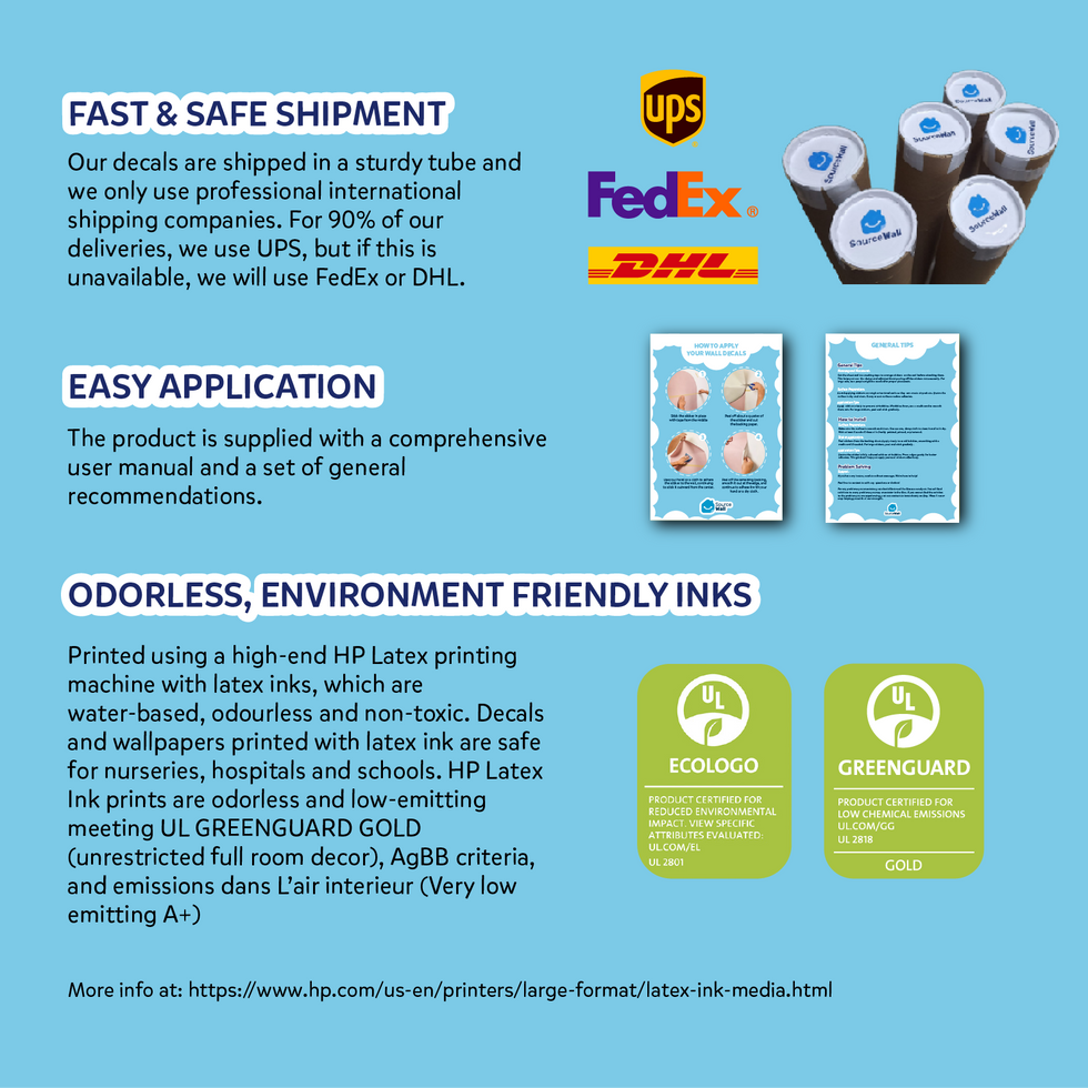 - IST ES SICHER, SIMPLE SHAPES WANDTATTOOS UND AUFKLEBER IN MEINEM BABY-KINDERZIMMER ZU VERWENDEN? Ja, wir produzieren alle unsere Wandsticker und Tapeten mit wasserbasierten HP Latex-Farben. Wasserbasierte Tinten sind geruchlos und ungiftig. Dieses Qualitätsversprechen macht diese Aufkleber zu einer verantwortungsvollen Wahl für umwelt- und gesundheitsbewusste Käufer. Sie haben die niedrigsten Emissionen und die besten umfassenden Zertifizierungen nach Weltstandards. Sie sind ECOLOGO, GREENGUARD, ENERGY STAR und EPEAT zertifiziert. Sie können dies auf der offiziellen HP-Website überprüfen.