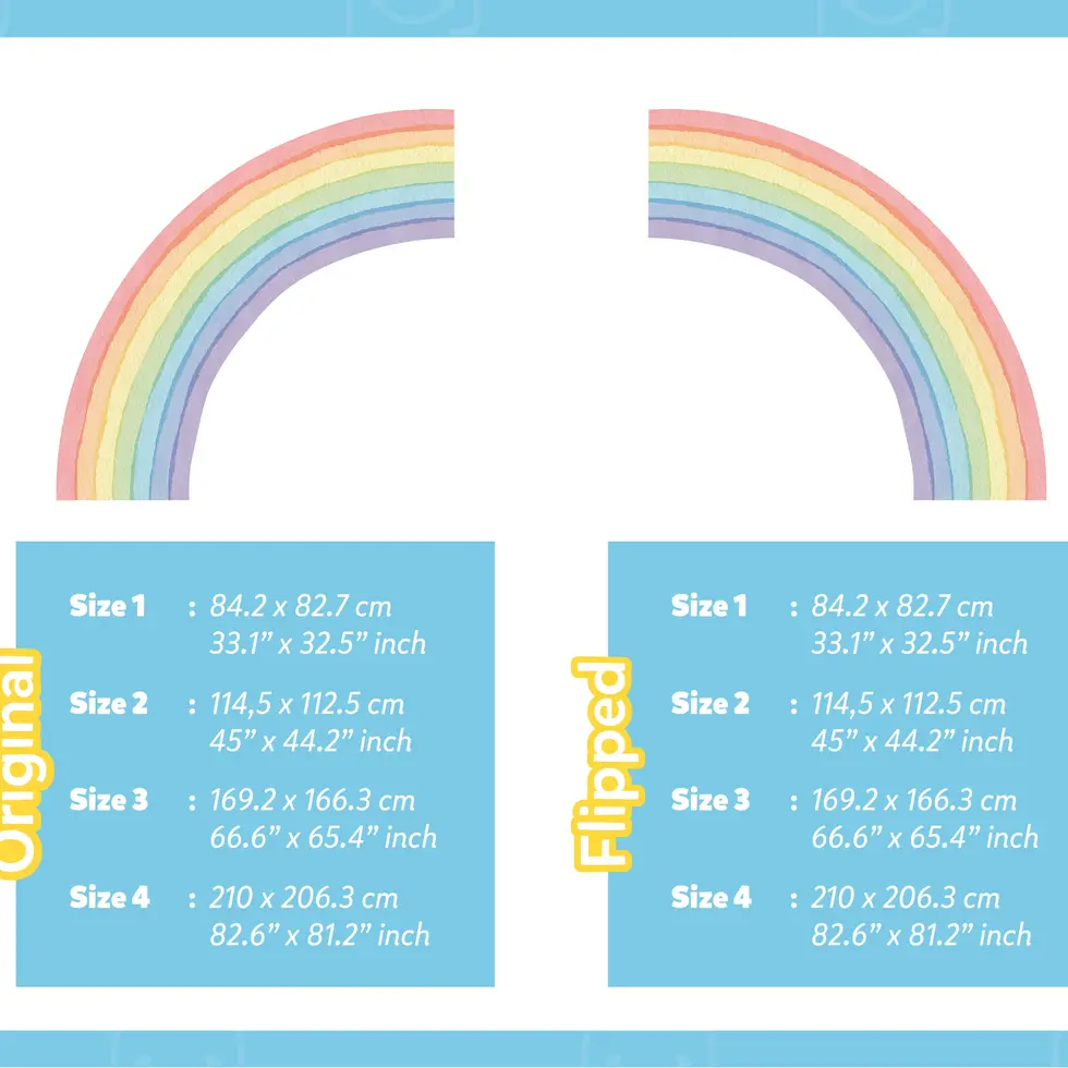 - RAINBOW: Available in Original or Flipped design. Size 1: 84.2 x 82.7 cm (33.1" x 32.5") Size 2: 114.5 x 112.5 cm (45" x 44.2") Size 3: 169.2 x 166.3 cm (66.6" x 65.4") Size 4: 210 x 206.3 cm (82.6" x 81.2")