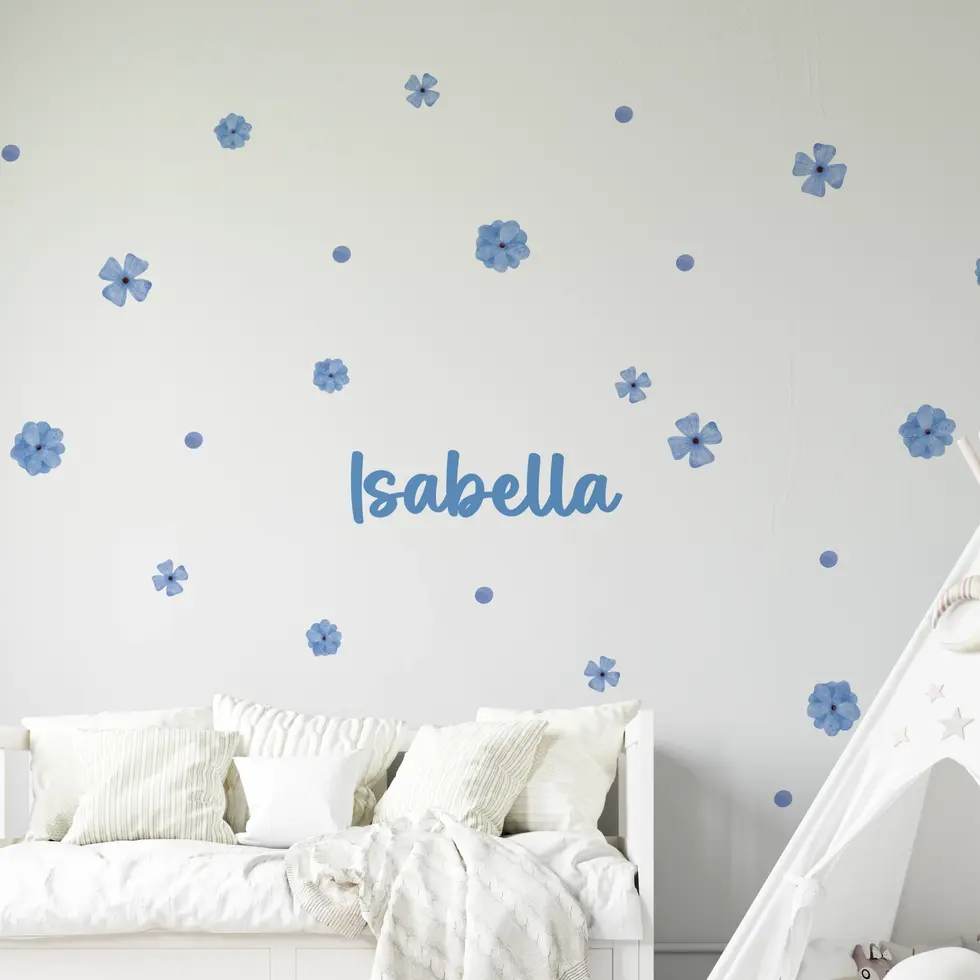 Personalized Name Decal! Add a beautiful and personal touch to your girl's room with our custom name and blue flowers set. This charming collection features your child's name in a lovely script font, surrounded by delicate watercolor flower decals. Perfect for a nursery or bedroom, these peel-and-stick stickers make it easy to create unique and playful wall decor that celebrates your little one.