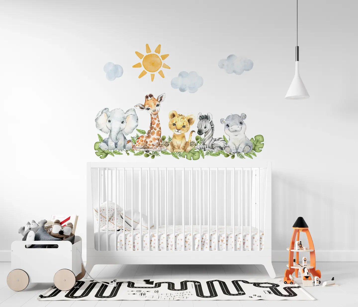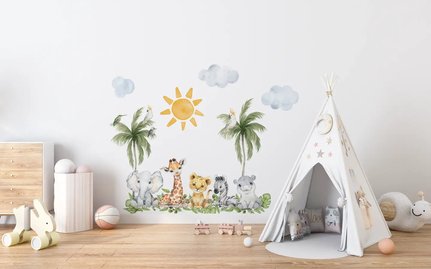 Safari Wall Decal! Transform your nursery into a gentle jungle adventure with our watercolor safari animals wall decal set. Featuring a beautiful tree alongside a baby lion, giraffe, and elephant, this jungle theme decal brings a storybook charm to any space. Our premium peel and stick stickers are easy to apply and fully removable, allowing you to create a stunning nursery mural without any hassle.